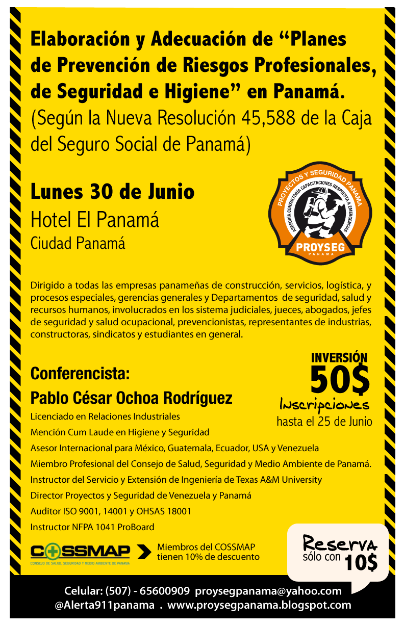 3) Nos complace invitarle para interesante y necesario evento, denominado Elaboración y Adecuación de "Planes de Prevención de Riesgos Profesionales, de Seguridad e Higiene" en Panamá. Como es de su conocimiento, la Resolución 45,588 de la Caja del Seguro Social de Panamá, exige que cada patrono poseer un Plan de Prevención de Riesgos inherente a la ocupación que desarrollen sus trabajadores. En esta conferencia tipo taller, cuya duración será de 08 horas (8 am-12m y 1 pm-5pm), tendremos la oportunidad de recibir la orientación necesaria para elaborar el plan requerido e implementar pasos asertivos en materia de gestión de riesgos ocupacionales y adicionalmente, cumplir con la legislación nacional.